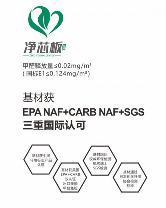 据了解,帝标高端全屋家居无醛净芯板采用的是MDI生态胶(无醛生态粘合剂),这种生态胶本身不含甲醛,且使用过程中不分解甲醛,能从源头杜绝甲醛危害。本着对极致环保的追求,对每一个细节的严苛把控,帝标的无醛净芯板基材获得了包括美国EPA-NAF和CARB-NAF双认证,国际权威环保监测机构瑞士SGS无醛添加检测三重国际权威认证。美国环保署的NAF(No-added formadehyde)无醛豁免认证,要求板材在生产过程中,不使用、不添加任何含有甲醛成分的胶水、助剂等;SGS是全球领先的检验、鉴定、测试和认证机构,是全球公认的质量和诚信基准,能获得SGS认证,意味着帝标无醛添加净芯板达到了世界范围内环保等级的金字塔尖。