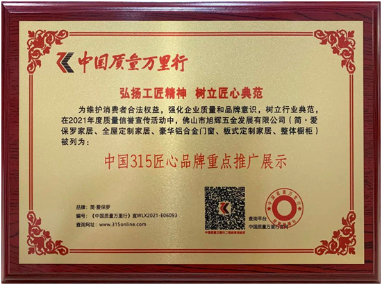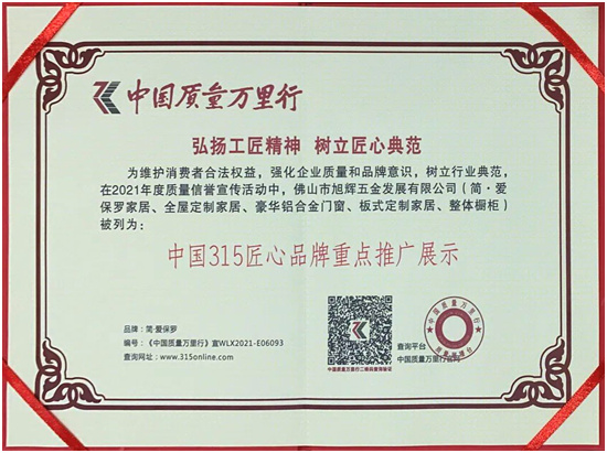 为维护消费者合法权益,强化企业质量和品牌意识,树立行业典范,在2021年度质量信誉宣传活动中,佛山市旭辉五金发展有限公司(简·爱保罗家居、全屋定制家居、豪华铝合金门窗、板式定制家居、整体橱柜)被列为:中国315匠心品牌重点推广展示。