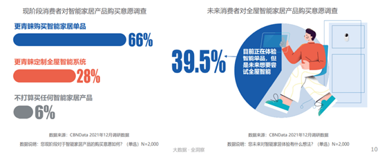 根据CBNData调研数据显示,现阶段有超六成消费者更青睐购买智能家居单品,相较于全屋智能定制,智能单品凭借低单价、高迭代、高试错空间等特点,更容易被消费者种草。同时消费者需求仍不断升级,其中有将近40%的消费者表示,虽然现阶段处于智能单品体验期,但未来仍想要尝试全屋智能系统。