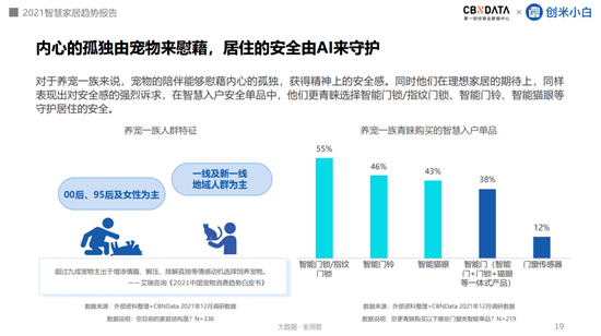 其中,养宠一族多以00后、95后及女性人群为主,更多居住一线及新一线城市。宠物对他们而言是陪伴自己、提供精神慰藉的朋友,而他们也非常关注居住的安全问题,倾向于选择智能门锁/指纹门锁、智能门铃、智能猫眼等智慧入户单品。