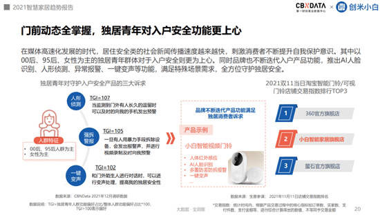 频发的独居被害案件,让独居群体的安全意识也更加强烈,尤其是以00后、95后、女性为主的独居青年群体,他们对智慧入户单品的功能需求偏好前三分别是人形侦测、异常警报、一键变声功能。