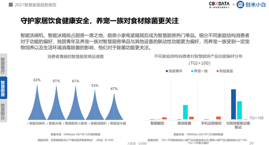 而在厨房领域,智能洗碗机、智能冰箱与智能厨房小家电是热门单品。不同家庭结构当中,养宠一族对食物的除菌功能更为关注。