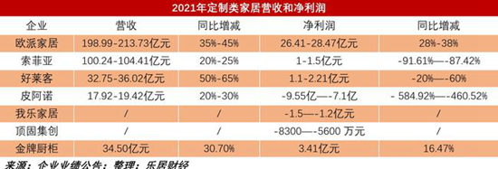 乐居财经统计发现,目前已有7家上市定制家居企业发布2021年业绩预告。其中,欧派家居、金牌厨柜实现营收和净利润增加,索菲亚、顶固集创、我乐家居、皮阿诺、好莱客净利润均出现下滑甚至亏损。