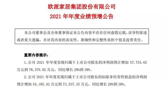 【泛家居营销结合报道】1月21日,欧派家居发布业绩预告,预计2021年全年归属净利润盈利26.40亿元至28.46亿元,同比上年增长28%至38%。预计2021全年实现营业收入与2020年同期相比将增加51.59亿元到66.33亿元,比上年同期增长35%到45%。2020年,欧派营业收入为147.40亿元,即使按最低标准,2021年欧派家居的营收将突破200亿大关。