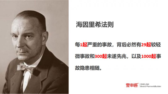 海因里希法则,当一个企业有300起隐患或违章,非常可能会发生29起轻伤或故障,另外还可能会有1起重伤、死亡事故。