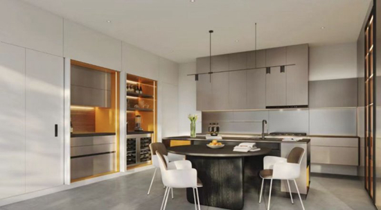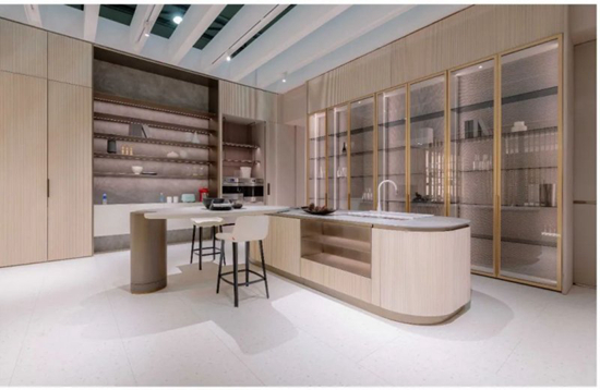 在2016年高定赛道慢慢浮显出来之后,定制行业的颜值提升非常明显,最简单的观察就是从原先的三氨板(三聚氰胺浸渍饰面板)为主的门板到现在的板、木、皮等多材质的应用,这些多材质的介入让产品外观的效果表达更加丰富。