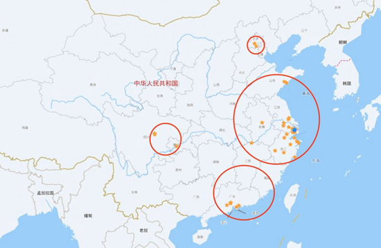 能看到分为四个产区(实为三个),第一个是华东片区 ,以江苏、浙江、上海为主要的长三角产业群。