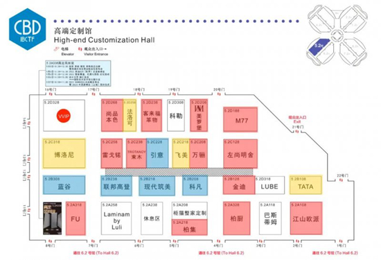 上图是2022建博会(上海)5.2馆高端定制馆 分布图,其中红色部分是华东地区代表的高端定制品牌,蓝色为华南地区代表品牌,黄色为华北地区代表品牌。