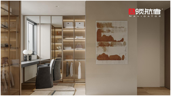 轻奢风在衣帽间又会是怎样的体现呢?首先领航者家居打造了一体式全透明的可视衣柜,通透敞亮。与独立式全木衣柜相比轻便感更强,不会产生压抑感;配合灯光,高级又有质感。这种玻璃衣柜还能防水防潮,密封性良好,是一款更适合现代精英的衣帽间。