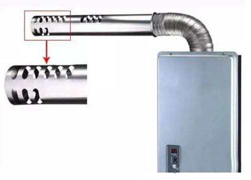 这种排烟管的前部是封死的,周围设有小孔,用于排出烟气。当冷空气吹入排烟管时,从一侧小孔进入就立即从另一侧小孔排出,由于前部封死,冷空气不会灌入到热水器里面,能够有效防止冻裂。
