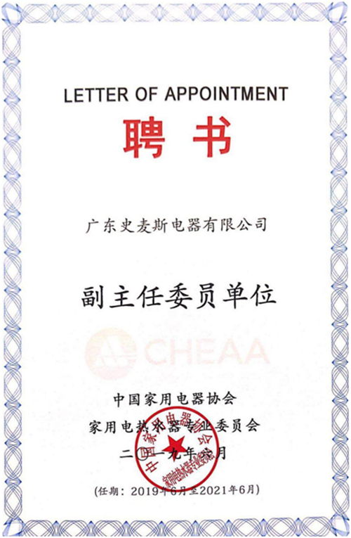 祝贺史麦斯厨电当选“国家电热水器专业委员会副主任委员单位”