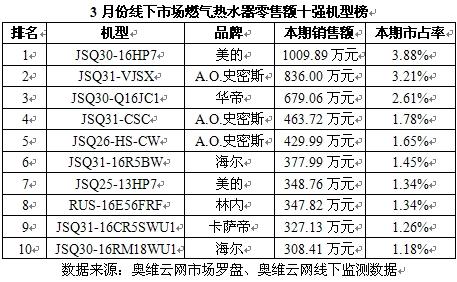奥维云网监测数据显示,3月份,线下市场燃气热水器零售额最高的10款产品,来自美的、A.O.史密斯、华帝、海尔、林内、卡萨帝等6个品牌。其中,A.O.史密斯占3款,美的和海尔各占2款,华帝、林内、卡萨帝各占1款。