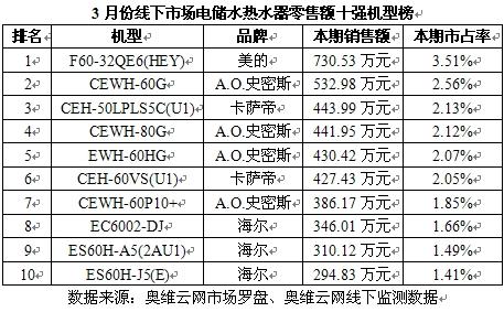 据奥维云网监测数据,3月份,线下市场电储水热水器零售额最高的10款产品,来自美的、A.O.史密斯、卡萨帝、海尔等4个品牌。