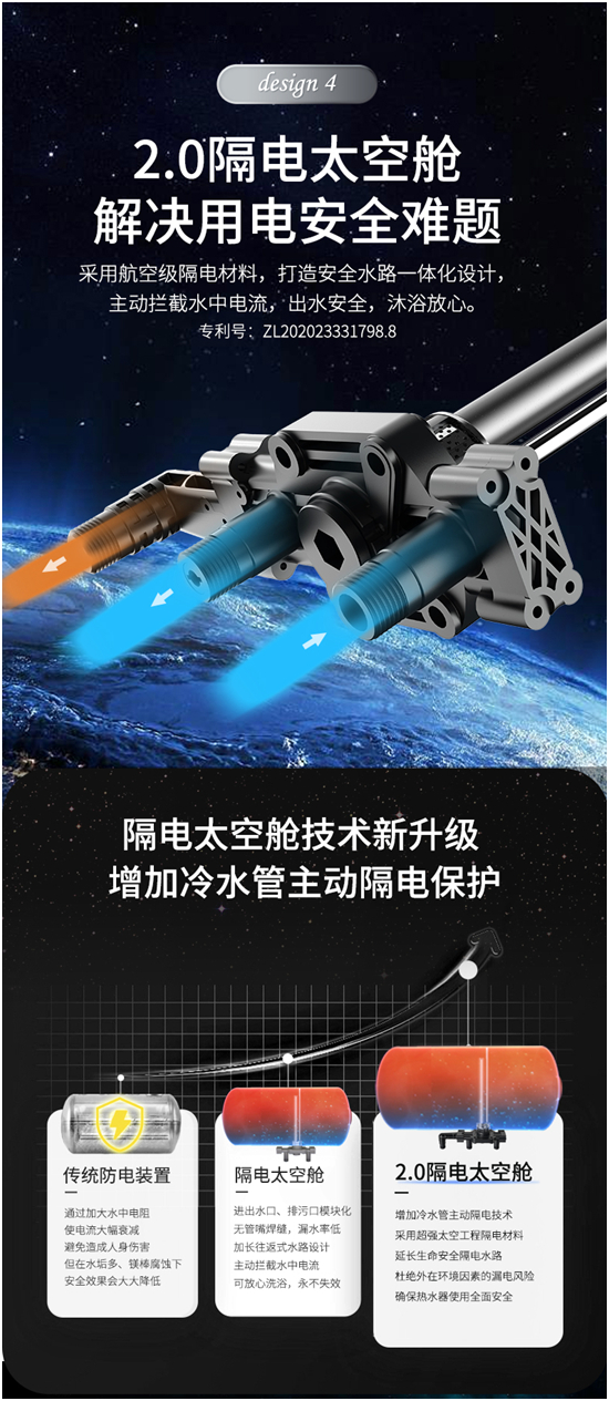 为满足消费者不断提升的生活品位,格美淇推出新品电热水器V6/T,其创新研发专利——隔电太空舱2.0,突破传统的防电保护装置,全方位守护沐浴安全,解决热水器“水中带电”风险,属于行业内的领先水平,给予你舒心沐浴的新体验!