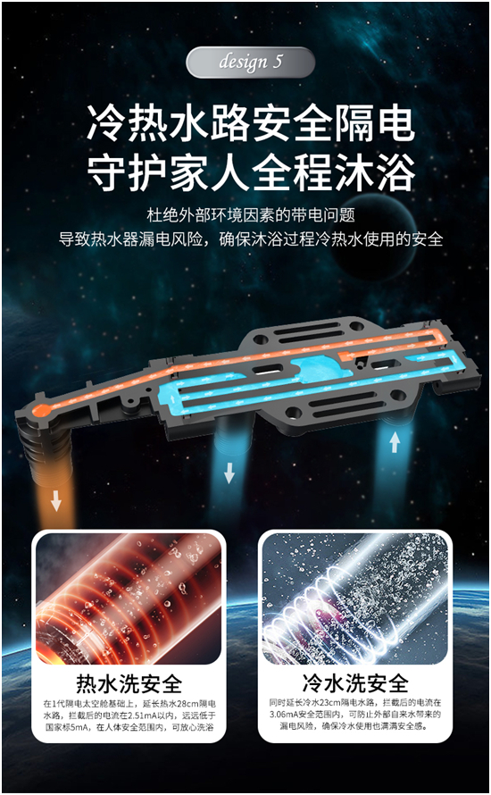 为了让用户有更好的沐浴体验,可以放心大胆地洗澡,格美淇经过潜心研发和实验,进一步升级隔电太空舱技术,创新推出了行业首发的专利隔电太空舱2.0,增加冷水管主动隔电技术模块,可防止环境漏电引起的外部自来水带电问题,解决了热水器用电安全的世界难题。全新推出的电热水器新品V6/T就采用了该项强大的安全防电技术,实时安全防护,无需反复开关机或拔掉电源。