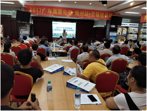 下午2点,会议正式开始。会议首先由广东顺德奥荣电器销售有限公司总经理林总登台亮相并为赣州区域的经销商们简单介绍了奥荣集团的发展历程以及奥荣未来3—5年的品牌发展规划!林总详尽且极具挑战性的发展目标让现场家人们都感到了压力,但不少现场的经销商家人们表示这将会是推动他们进步前进的动力!
