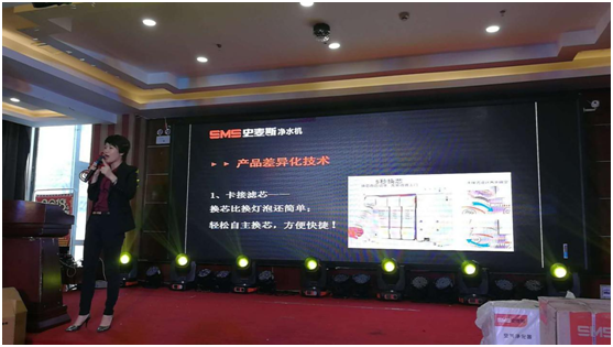 另外,净水事业部作为史麦斯近年来大力发展的厨卫市场细分项目之一,其发展迅猛,在市场上已具备了赶超众多知名品牌的口碑。而在本次会议中,为使临沂经销商们更好地了解到史麦斯净水产品如何实现“弯道超车”,史麦斯净水事业部营销总监唐心榆登台为家人们做一一的展示。智能化产品、多功能切入,史麦斯净水产品以绝对的科技优势走在了行业的前端,此外,史麦斯产品向来以品优质稳的优点著称,相信在科技含量与产品品质的相辅相成之下,史麦斯定能在2018年中实现品牌跨越式发展。