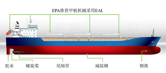 油水界面:存在油水界面的设备包括但不限于以下几种:可调距桨、推进器液压油及其他可能从油封或表面排放润滑油入海的设备(如明轮、尾轴管、螺旋桨轴承、减摇装置、舵承、全回转推进器、吊舱式推进器、浸没的钢丝绳和机械设备等)。VGP 2013推荐但不强制甲板机械等可能有雨水冲刷造成污染的设备使用EAL。