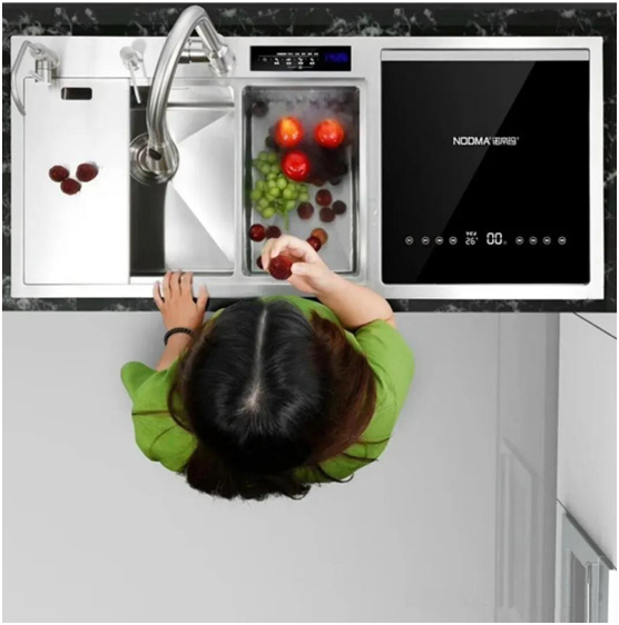 诺帝玛双触媒果蔬智能净化水槽,采用高端SUS304不锈钢,纯手工打造;3.5MM超厚面板,1.2MM超厚槽体,打造金刚不坏之身;精细R10弧线打磨,更易打理;内置隐藏刀架,刀具嵌入摆放更省心;多种款式、大小面板可选,满足不同厨房需求。