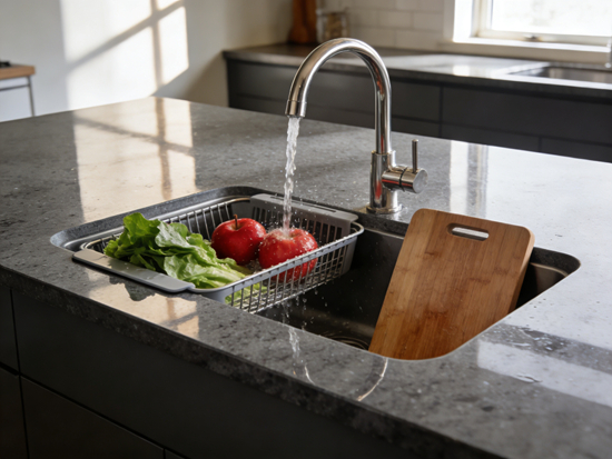 家用水槽追求美观与空间适配性。主流规格以单槽(600-800mm)、双槽(750-900mm)为主,深度多在180-220mm之间。造型上,台下盆、台中盆因其易清洁、台面一体感强而受青睐。近年来,阶梯式导流槽、X型导水线等细节设计成为卖点。