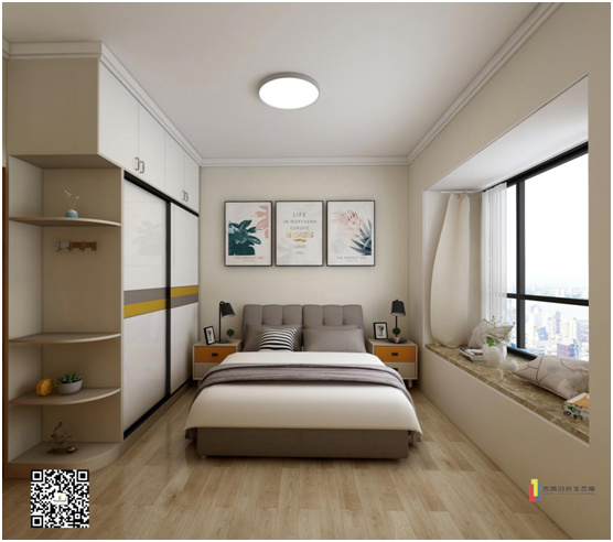 导师点评:整体风格呈现出温馨、实用、休闲的室内空间氛围,到顶的衣柜和转角的圆弧柜实用美观,安全性能高。