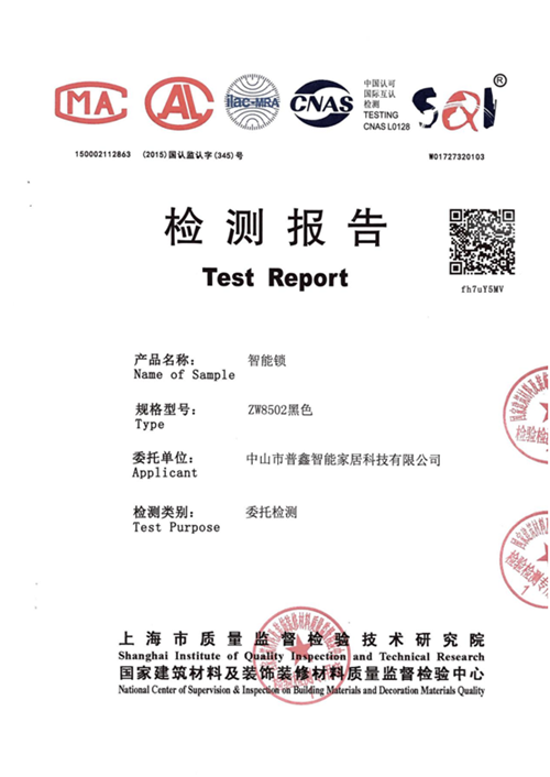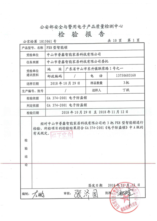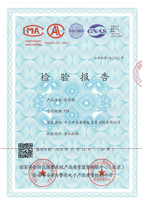 普鑫智能锁各项测试结果均达到检测依据相关规定。