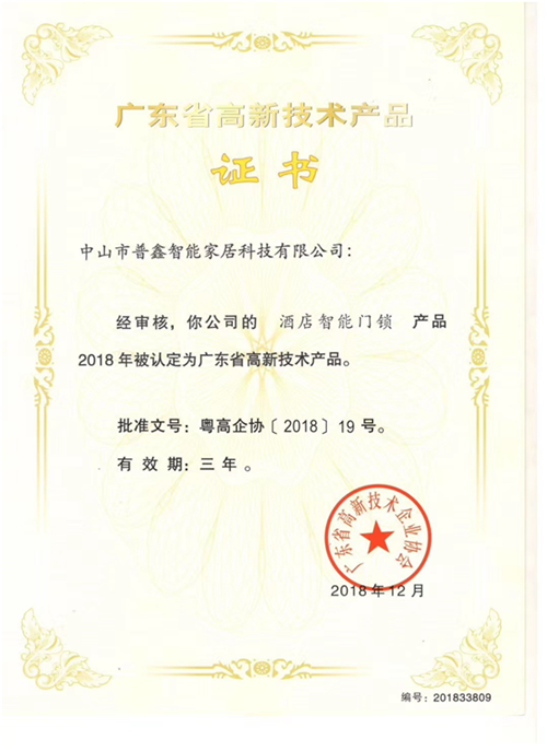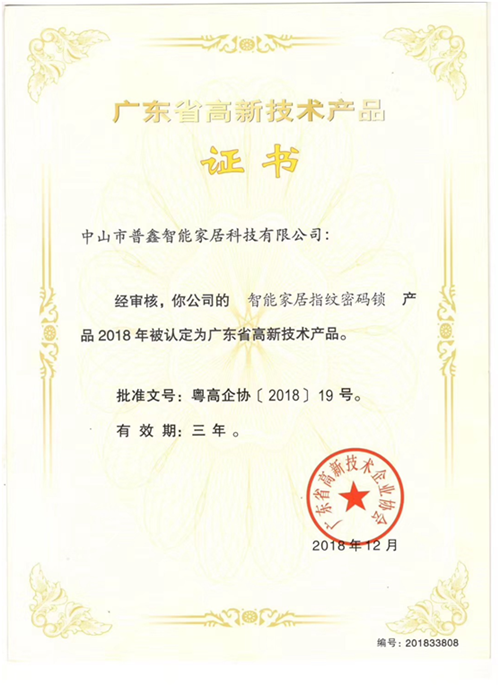 经广东省高新技术企业协会认证专家组的严格审核,中山普鑫智能锁生产的智能家居指纹密码锁和酒店智能门锁被授予“广东省高新技术产品”证书。