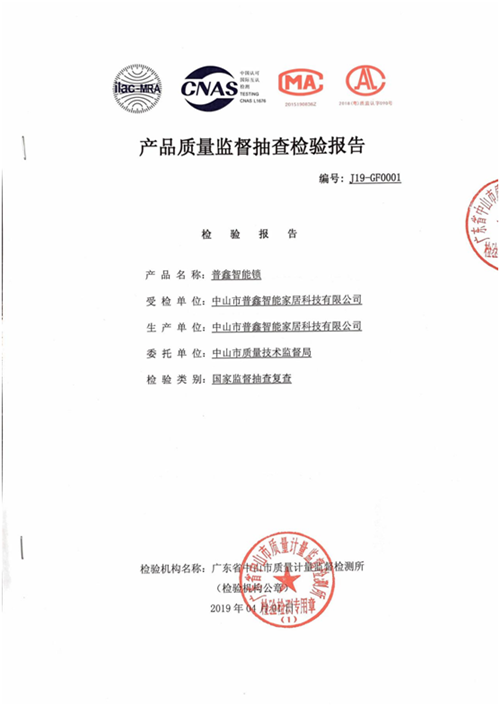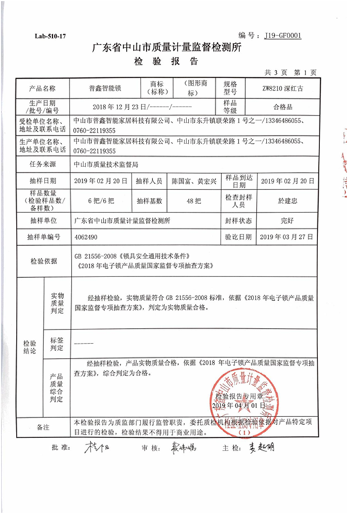2019年2月20日—4月1日,在中山市质量技术监督局专业级质检实验室中,经过近两个月的缜密检测与严苛考验,普鑫智能锁最终拿到了“样品符合全部检测要求”的优异成绩。这是对普鑫多年深耕行业,打造匠心产品的肯定,也是对普鑫专注智能锁研发创新的一种鼓励。同样地,在普鑫谨慎到几乎苛刻的选材与产品质检机制下,这样的结果并不出人意料。