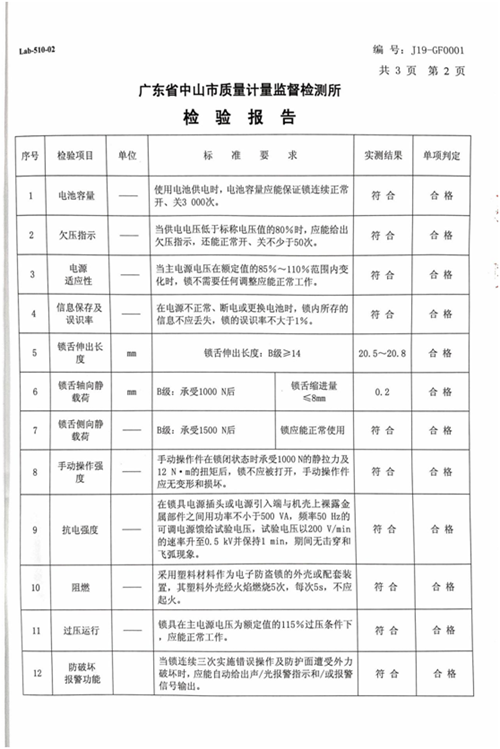 其中,普鑫智能锁在“电池容量”、“欠压指示”、“电源适应性”、“信息保存及误识率”、“锁舌伸出长度”、“锁舌轴向静载荷”、“锁舌侧向静载荷”、“手动操作强度”、“抗电强度”、“阻燃”、“过压运行”、“防破坏报警功能”等12个单项检测中,均符合国家要求!