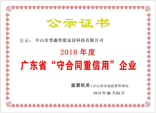 诚信似山,沉稳肃静;诚信似河,执着向前;诚信似光,照亮人心。日前,广东省中山市市场监督管理局正式公示了“2018年度广东省守合同重信用企业”名单,普鑫智能锁凭借良好的信誉与契约精神顺利通过评审,获评“广东省守合同重信用企业”荣誉称号。这是普鑫智能家居科技有限公司连续四年获此荣誉证书。