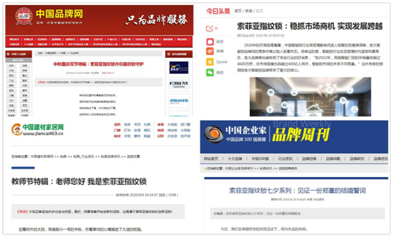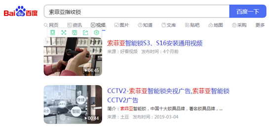 有了官网的助力,我们对索菲亚指纹锁品牌的了解已有60%,但奋勇争先的我们还得继续往上“加分”。这时候我们可以通过在百度搜索品牌的相关新闻资讯,来看看媒体眼中的索菲亚指纹锁又是怎样的?逐一点击新闻资讯,相信大家都发现了这些刊登索菲亚指纹锁新闻报道的媒体权威度及知名度都颇高,如《中国建材家居网》、《今日头条》、《搜狐网》、《中国品牌网》等媒体都拥有极高的传播影响力及高覆盖率。可见,能得到权威媒体认可、能受到读者欢迎的索菲亚指纹锁,早已积累了一定的口碑与美誉度。