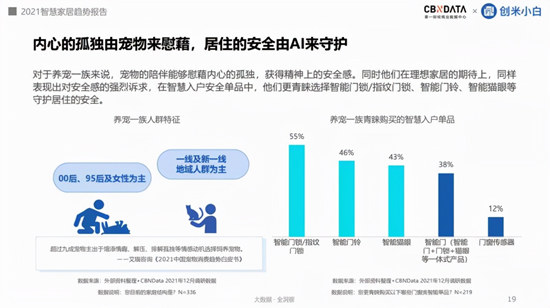 作为归家入户的第一道保障,“家门”的安全性是消费者所普遍关注的。根据CBNData《报告》显示,在智慧入户方面,消费者更青睐智能门锁、智能门、智能猫眼等产品。不同的家庭结构中,养宠一族、独居青年、有娃家庭更在意入户场景的安全。