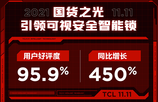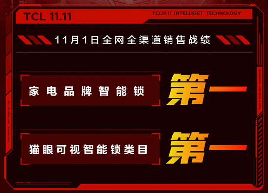 双十一期间,TCL智能门锁交出了傲人的“成绩单”:TCL智能锁斩获全网全渠道家电品牌智能锁第一、猫眼可视智能锁类目全网第一!同时,TCL可视安全智能锁的用户好评度高达,同比增长450%,可谓销量口碑双丰收!