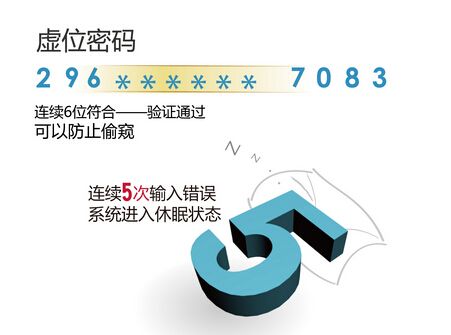 例:王先生下班回家约了同事在家聚餐,同事跟他上楼以后,王先生按密码开门。虽然同事就站身后等着进门,但王先生在自己的原来设置密码“1314520”前面和后面胡乱输了很多数字,密码验证成功。这个虚位密码功能帮助王先生消除担心被同事看到家门密码的尴尬。同事还问他,开门密码这么长你能记住吗?能否记住王先生心里可很清楚呢。