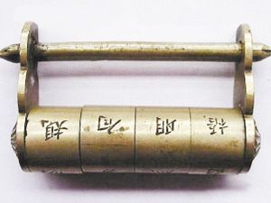 展厅中,一把清代古锁吸引了许多观众驻足欣赏。古锁为圆柱体造型,锁身上从上到下排列着5个大小相同的铜环,每个铜环表面都刻有“甲、乙、丙、兔、马、蛇”等汉字,铜环可自由转动,排列出不同的汉字组合。李辉芳说,这种锁名为“无匙锁”,只有将锁身的铜环旋转到特定的位置,才能打开。无匙锁的锁芯结构与现代的密码锁基本相同。“这把锁子上面刻的是天干地支和十二生肖名称,可能用来纪念一个特殊的日期。”李辉芳说。