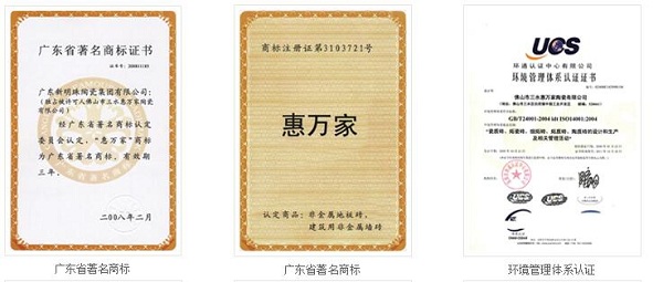 惠万家品牌近年来先后荣获"国家强制性3C产品认证"、"广东省著名商标"、 "陶瓷优质产品认证"等众多荣誉,广受消费者认可。集团公司拥有佛山禅城南庄生产基地、三水高技术生产基地、高要禄步生产基地,三大生产基地以强大的实力支撑惠万家陶瓷形成了"一条线、一品种、一规格、一花色"的规模化专业生产优势,能满足不同层次的消费需求。