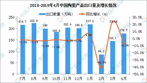 据中商产业研究院数据库显示,2018年1-3季度中国陶瓷产品出口量呈增长趋势,2018年4季度中国陶瓷产品出口量下降。2019年4月中国陶瓷产品出口量为176.7万吨,同比下降6.9%。