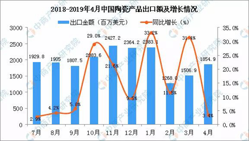 从金额方面来看,2018年1-4季度中国陶瓷产品出口金额呈震荡上行,2019年4月中国陶瓷产品出口金额为1854.9百万美元,同比增长3.4%。