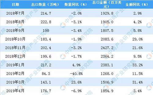 2018年-2019年4月中国陶瓷产品出口数量及金额增长率情况