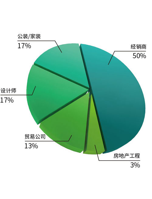 从买家行业属性上看,经销代理商依然是最大的买家群体,占比 50%,比 33 届下降了 5.6%,而公装家装和设计师群体占比为34%,对比32届增长41%,贸易公司占比为13%,比32届增长30%,房地产工程占比3%。通过近两届的数据对比分析,整装、房地产行业的比例将继续增加,这类渠道或将成为未来陶瓷卫浴企业开拓市场主要的营销渠道。