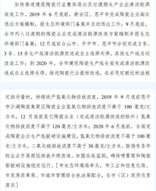 今年年初,江门市人民政府办公室印发《江门市环境空气质量限期达标规划(2018-2020年)》(以下简称“规划”),其中要求“大力推动恩平市陶瓷产业逐步退出。”此次方案中,明确提出“加快推进建筑陶瓷行业整体退出”并列出了改造的时间线: