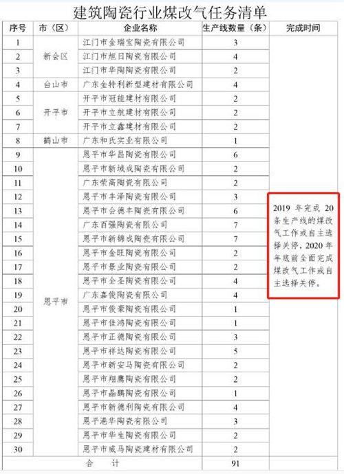 方案还列出了建筑陶瓷行业煤改气任务清单。根据清单,江门市目前有91条生产线,其中2019年要完成20条生产线的煤改气工作或自主选择关停,2020年底前全面完成煤改气工作或自主选择关停。