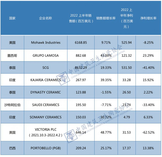 沙特阿拉伯陶瓷巨头SAUDI CERAMICS 是为数不多销售额出现收缩的陶企。2022年上半年,SAUDI CERAMICS销售额为2.12亿美元,同比下降7.71%,受销售走低和成本上涨的双重影响,SAUDI CERAMICS净利下滑33.40%。