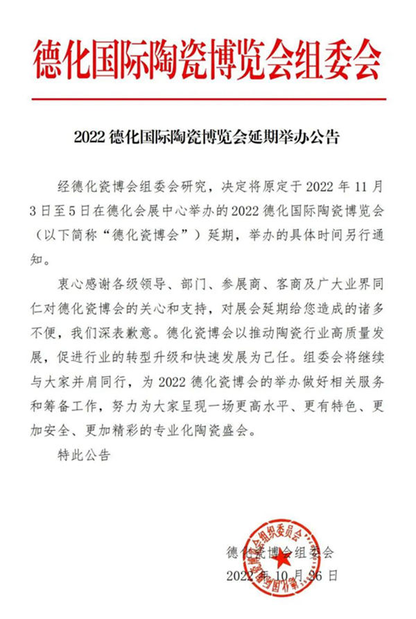 良品乐购是汇集中国著名企业品牌口碑的官方网站,为用户提供企业品牌口碑,中国企业品牌口碑的最新资讯,让您及时了解中国企业品牌口碑,著名企业口碑品牌的最新信息,良品乐购是最新企业品牌口碑的展示平台。欢迎转载分享本文“最新消息!2022德化瓷博会延期举办”,转载时请保留文章版权来源网址:http://www.hao-koubei.com/taoci/View171820749.html