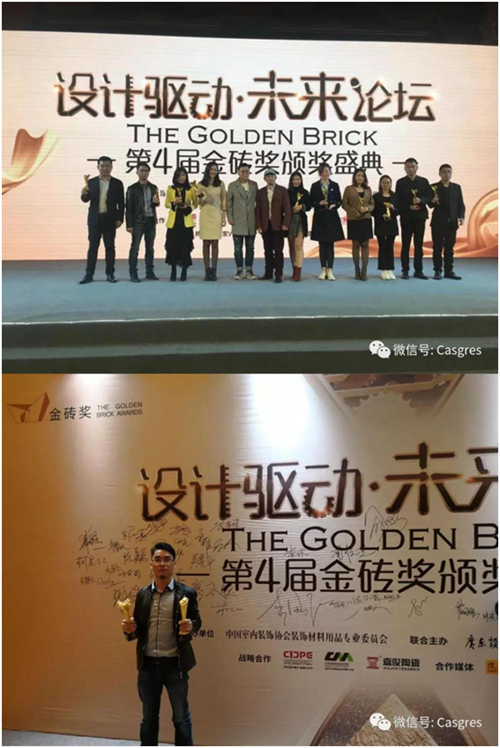 1月19日,2018“设计驱动未来”论坛暨第四届金砖奖——全国空间设计大赛在佛山罗浮宫索菲特酒店内隆重举行。佛山市恺瑟格斯陶瓷有限公司受邀参与本次盛宴。在颁奖典礼上,恺瑟格斯瓷砖凭借着形象厚重质朴、触感温润细腻的“古堡印象”系列产品获得了“最佳产品奖”;此外,凭借韩国CGV电影院的国际工程获得了“最佳瓷砖应用设计工程案例奖”。此次一举获得两枚重磅殊荣,是恺瑟格斯一直以来,以产品为原点,以应用为核心的产品原创理念进行创新发展的成果,也是被行业专业人士认可的最佳体现。