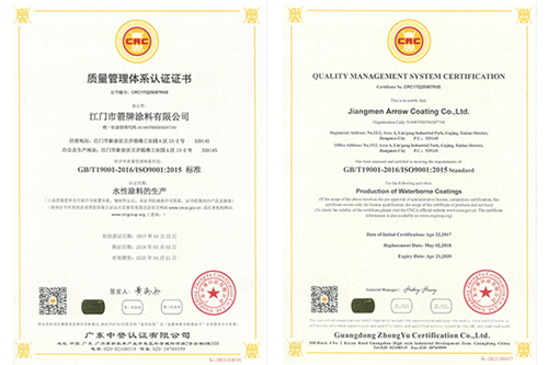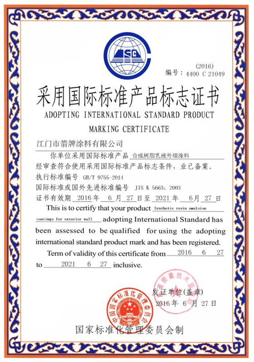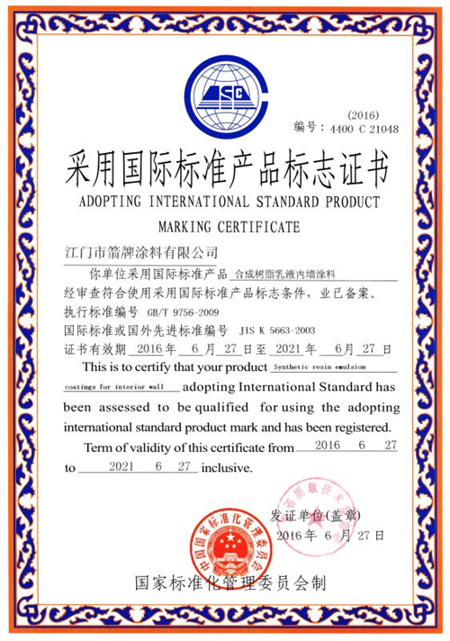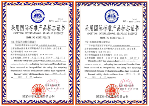江门市箭牌涂料有限公司的产品质量早已通过了国家权威部门的严格审核,荣获经由国家标准化管理委员会颁发的“采用国际标准产品标志证书”。自从获得这项证书以来,箭牌漆始终不忘初心,砥砺前行,严格把好产品质量关,确保投放到市场上的每一个产品是优质、健康、环保的;并且,箭牌漆在技术、销售、服务等各方面积极寻求创新升级,倾力打造“产品先进性”,获得了重大突破!