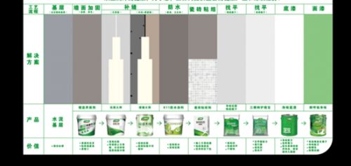某涂料品牌建立信息化终端专卖店,丰富和补齐内墙乳胶漆、艺术漆、外墙、仿石升级系列涂料、水性木器漆和辅料、防水、腻子、工具产品线,完善产品体验道具,增加与消费者的互动,实现产品一站式体验。内外墙乳胶漆增加专用调色漆及艺术漆,增强色彩与艺术效果体验;外墙四大金刚系列,增强外墙多样式效果,木器漆丰富其专用辅材,增强木器漆效果和终端体验度,提高产品的附加值;配套上进一步完善的辅材体系,解决家庭涂装一体化的需求,节省时间成本,轻轻松松解决家装难题。