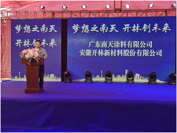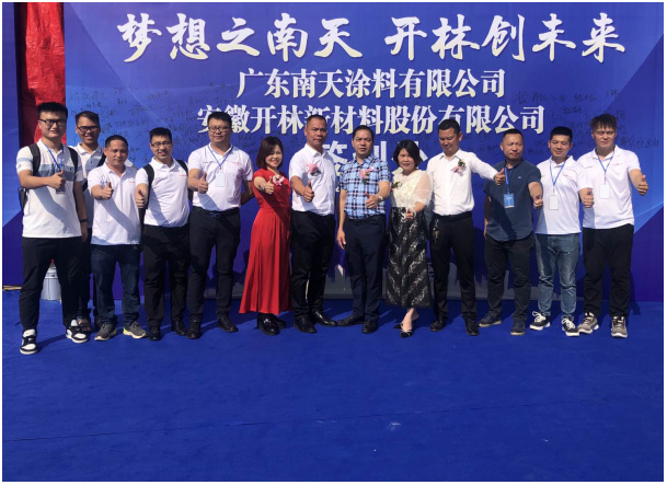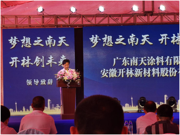 2020年9月6日,以“梦想之南天 开林创未来”为主题的广东南天涂料有限公司与安徽开林新材料股份有限公司的合作签约仪式暨南天涂料华东区生产基地启动庆典在安徽省天长市铜城工业园区盛大举行!天长市副市长周继安、安徽开林新材料股份有限公司董事长王和山,广东南天涂料有限公司董事长张铨秋、总经理祝燕弟,安徽涂料行业协会秘书长陈祖良,广东涂料行业协会会长陈冰等领导一同出席了本次庆典活动。
