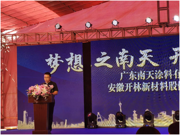 会上,天长市副市长周继安、广东涂料协会会长陈冰、安徽开林董事长王和山及受邀前来的当地行业领导都发表了重要讲话,为华东区生产基地的未来指明了正确的方向并对其寄予了期许。随后,天长市政协主席董学文和陈冰会长为南天涂料华东生产基地揭牌。