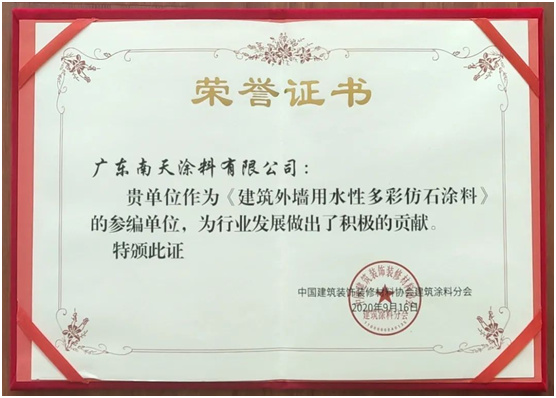 作为参编企业之一,南天涂料凭借在建筑外墙涂料领域的建设成果,与专业机构及其他参编企业为如何更好的发展仿石漆行业提出了宝贵建议,为建筑外墙用水性多彩仿石涂料的有序、健康、快速发展而做出贡献。被授予《建筑外墙用水性多彩仿石涂料》参编单位证书。